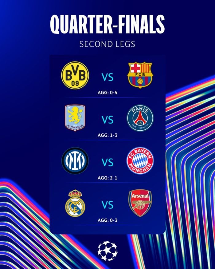 Четыре команды продолжают борьбу в нынешнем розыгрыше Лиги чемпионов УЕФА, и полуфиналы начнутся в конце апреля. «Арсенал» встретится с «Пари Сен-Жермен» в противостоянии команд, стремящихся к своему первому титулу ЛЧ, а «Интер» и «Барселона» сойдутся в битве континентальных тяжеловесов.