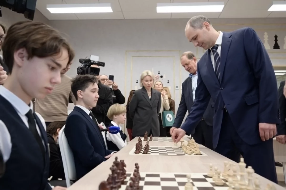 После торжественной части в новом классе был проведен сеанс одновременной игры с гроссмейстером Дмитрием Кокаревым. Символический первый ход в игре сделал Денис Паслер.